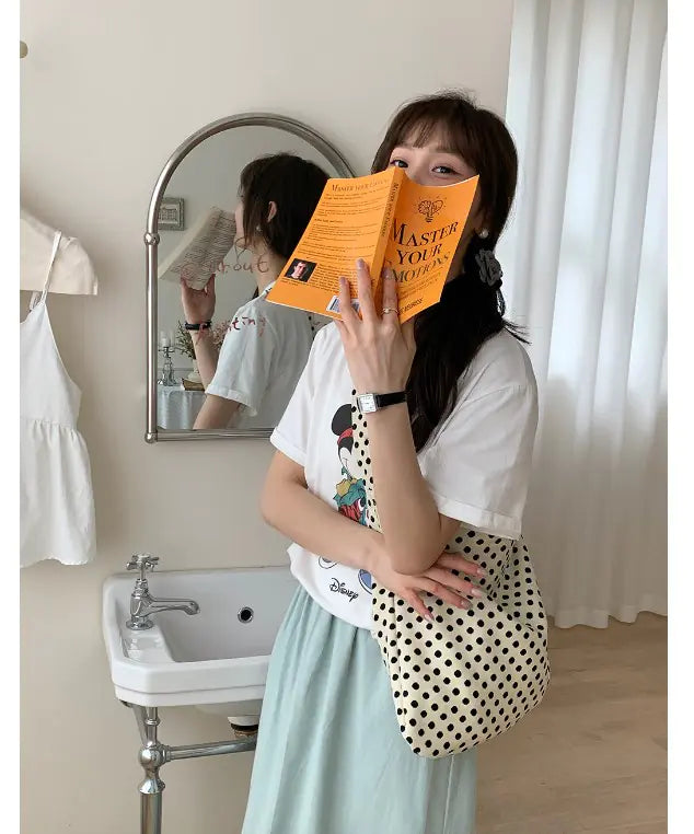 Our double-layered crossbody bag showcases a chic white base adorned with stylish black dots, making it a fashionable choice for any occasion. The lightweight design, weighing only 0.05 kg, ensures you can carry it with ease throughout your day.